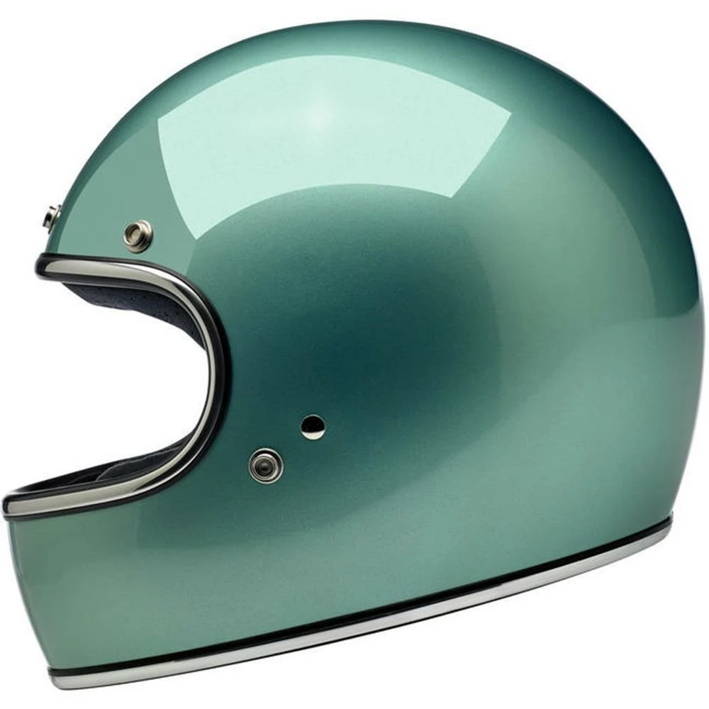 This tragically hip yet mercifully under-styled DOT approved skid lid ditches trendy vents and gizmos to create a stripped-down aesthetic that screams “”high speed””. Features include a seamlessΒ injection-mouldedΒ ABS outer shell, shock-absorbing EPS inner shell and a hand-stitched comfort liner with open-cell foam and brushed Lycra construction. The comfortable chinstrap is adorned with brushed Lycra material on touch points and a flat D-ring fastener with an adjustable snap-style end retainer. The BioFoam chin guard inside the Gringo picks up the liner’s stitched diamond pattern with contrasting thread that matches the ventilated polyester panels inside. Sizes include XS through XXL. Five snaps around the Gringo’s eye port facilitate easy installation of a Biltwell bubble shield or flat flex screen (sold separately.) Biltwell’s first full-face design takes its born-in-the-’60s motorsport aesthetic and elevates it to modern ECE R22.05 motorcycle standardsβthe European safety protocol recognized by leading helmet makers and independent test labs as the toughest in the world.