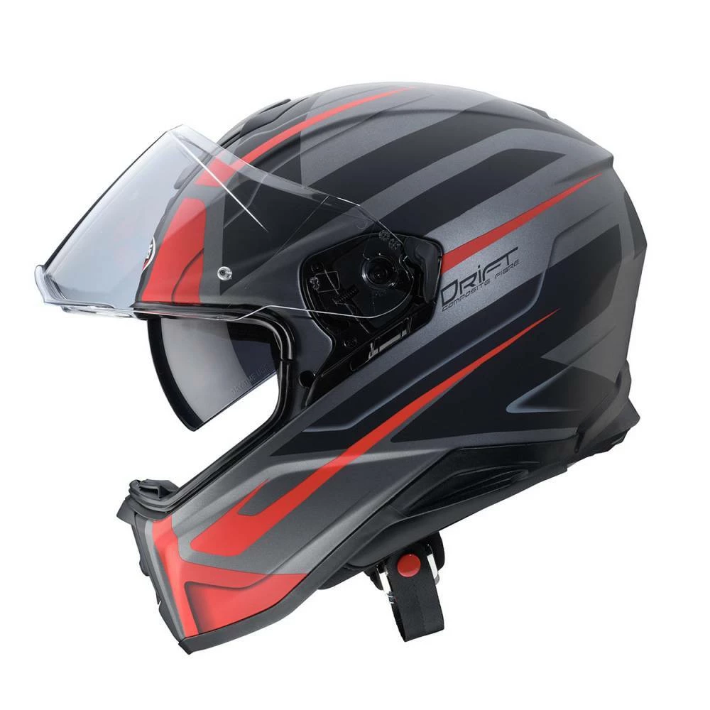 DRIFT is equipped with a transparent anti-scratch visor, an adjustable Max Vision Pinlock lens to avoid fogging , and an integrated anti-scratch sunshade visor easily manoeuvrable with lateral lever.
